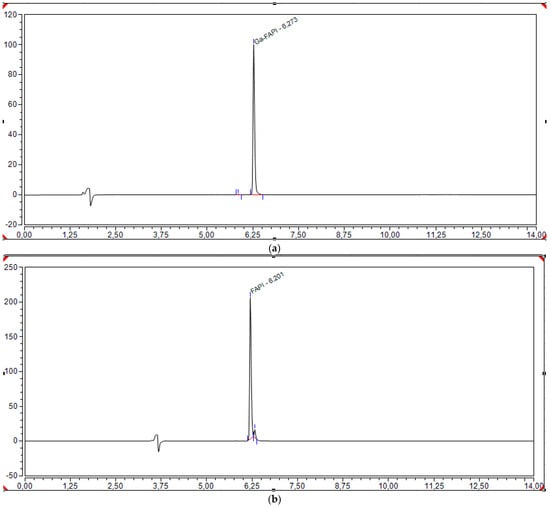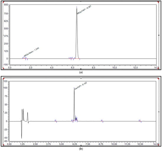 Chromatograms of standard solutions of (a) natGa-FAPI-46 (20 µL of a 0.1 mg/mL solution and (b) FAPI-46 (20 µL of a 0.04 mg/mL solution. Rt of natGa-FAPI-46 is slightly lower than that of [68Ga]Ga-FAPI-46 with radiometric detection because it is positioned after the UV detector.