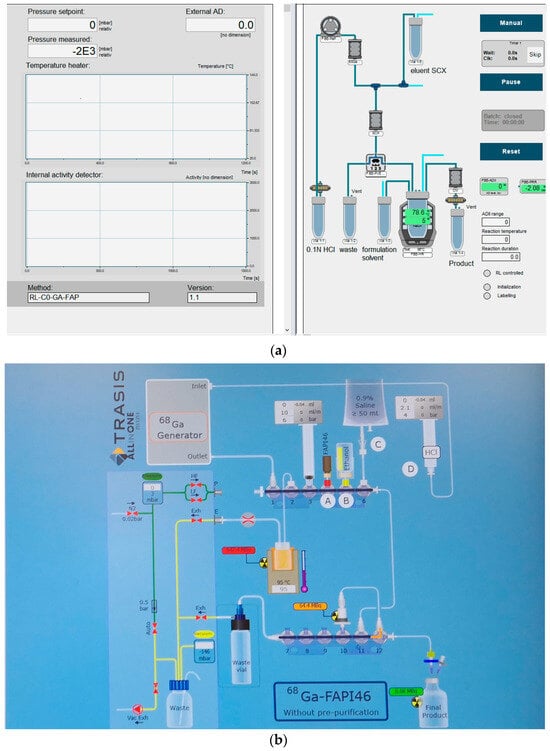 - Rubira, L.; Torchio, J.; Fouillet, J.; Vanney, J.; Fersing, C. GMP-Compliant Automated Radiolabeling and Quality Controls of [68Ga]Ga-FAPI-46 for Fibroblast Activation Protein-Targeted PET Imaging in Clinical Settings. Chem. Pharm. Bull. 2024, 72, 1014–1023. [Google Scholar] [CrossRef] [PubMed]