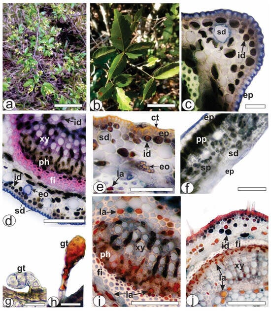 Histochemical analysis of leaf secretory structures of A. edulis. Fresh material. (a) Plant in inhabit. (b) A twig. (c,d) Detection of secretory ducts and essential oil by NADI reagent in the midrib. (e) Exposure of secretory ducts and essential oils by Sudan III in the midrib. (f) Positive result for secretory ducts in the lamina by NADI reagent. (g) Glandular trichome without reaction. (h) Observation of lipophilic material in the glandular trichome using Sudan III. (i) Detection of latex in the laticifers of petiole by red oil O reagent. (j) Positive result of the presence of latex in the laticifers of petiolule by red oil O reagent. [ct: cuticle, eo: essential oil, ep: epidermis, fi: fiber, gt: glandular trichome, id: idioblast, la: laticifer, ph: phloem, pp: palisade parenchyma, sd: secretory duct, sp: spongy parenchyma, xy: xylem]. Scale bars: (a) = 5 cm; (b) = 10 cm; (d,e,f,i,j) = 50 µm; (c,g,,h) = 20 µm.