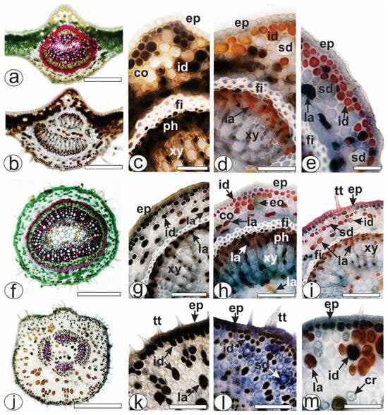 Histochemical analysis of leaf secretory structures of A. edulis. Fresh material. (a–e) Midrib. (f–i) Petiole. (j–m) Petiolule. (a,f,j) Positive reaction of fibers and xylem with phloroglucinol/HCl. (b,c,k) Detection of phenolic compounds by ferric chloride solution. (d,h) Detection of tannins by vanillin. (e) Detection of alkaloids in the laticifers by Dragendorff. (g) Phenolic compounds in reaction with potassium dichromate solution. (i,m) Detection of latex in the laticifers by red oil O reagent. (l) Detection of essential oils in the secretory ducts by NADI reagent. [co: collenchyma, cr: crystal, eo: essential oil, ep: epidermis, fi: fiber, id: idioblast, la: laticifer, ph: phloem, sd: secretory duct, tt: non-glandular trichome, xy: xylem]. Scale bars: (f,j) = 500 µm; (a,b) = 200 µm; (c,g–i,k,l,m) = 50 µm; (d,e) = 20 µm.