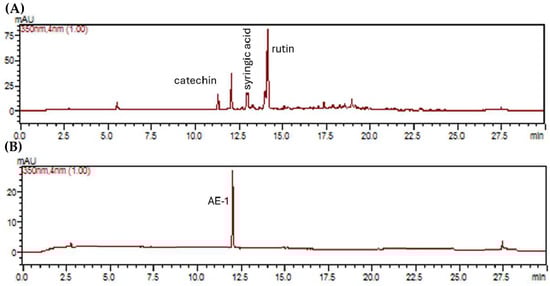 Representative LC-DAD chromatograms recorded at 350 nm of (A) ILAE and (B) AE-1.
