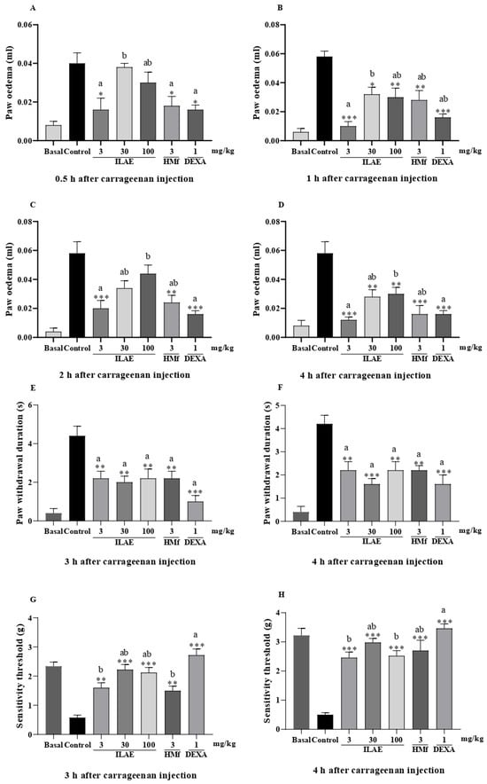Effect of oral ILAE (3, 30 and 100 mg/kg), HMf (3 mg/kg), DEXA (1 mg/kg), or the vehicle (control) administration on (A–D) carrageenan-induced paw edema; (E,F) acetone-induced cold allodynia, and (G,H) mechanical hyperalgesia in mice. Each point represents the mean ± SEM of 5 animals. (*) symbol indicates the significant differences between treated groups compared with control group (* p < 0.05, ** p < 0.01 and *** p < 0.001). The letters (a and b) indicate the significant differences between treated groups (p < 0.05).