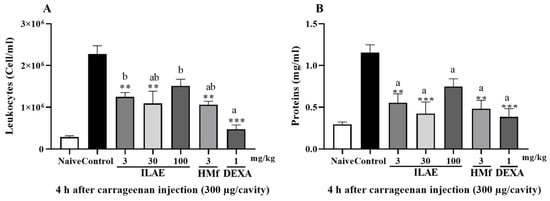 Effect of oral treatment with ILAE (3, 30 and 100 mg/kg), HMf (3 mg/kg), in carrageenan-induced pleurisy model, measured by (A) total leukocyte count and (B) protein dosage. The other induced groups received DEXA (1 mg/kg, p.o.), or the vehicle (control). The data are represented as the mean ± SEM of 5 animals. The (*) symbol indicates the significant differences between treated groups compared with control group (** p < 0.01 and *** p < 0.001). The letters (a and b) indicate the significant differences between treated groups (p < 0.05).