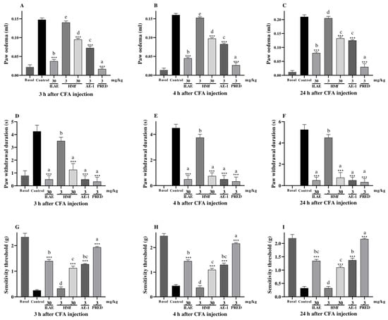Effect of oral treatment with ILAE (30 mg/kg), HMf (3 and 30 mg/kg), AE-1 (3 mg/kg), PRED (3 mg/kg), or vehicle (control) on (A–C) CFA-induced paw edema; (D–F) acetone-induced cold allodynia, and (G–I) mechanical hyperalgesia in mice, by 3, 4 and 24 h after CFA injection. Each point represents the mean ± SEM of 5 animals. The (*) symbol indicates the significant differences between treated groups compared with control group (*** p < 0.001). The letters (a, b, c, d and e) indicate the significant differences between treated groups (p < 0.05).
