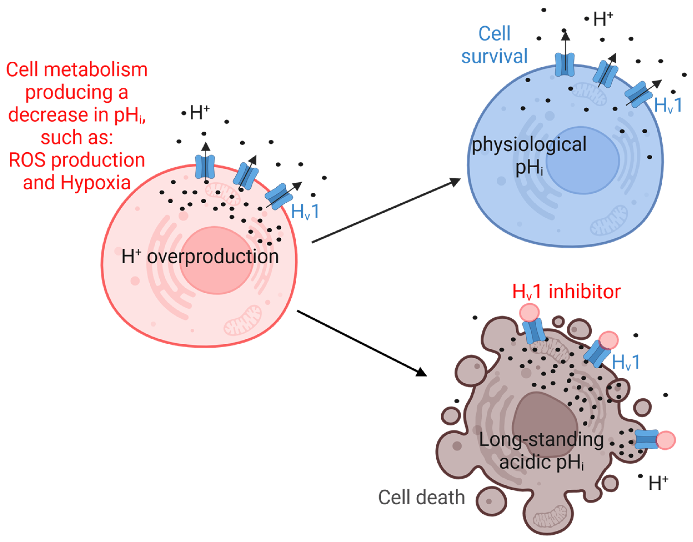 - Alvear-Arias, J.J.; Pena-Pichicoi, A.; Carrillo, C.; Fernandez, M.; Gonzalez, T.; Garate, J.A.; Gonzalez, C. Role of voltage-gated proton channel (Hv1) in cancer biology. Front. Pharmacol. 2023, 14, 1175702. [Google Scholar] [CrossRef]