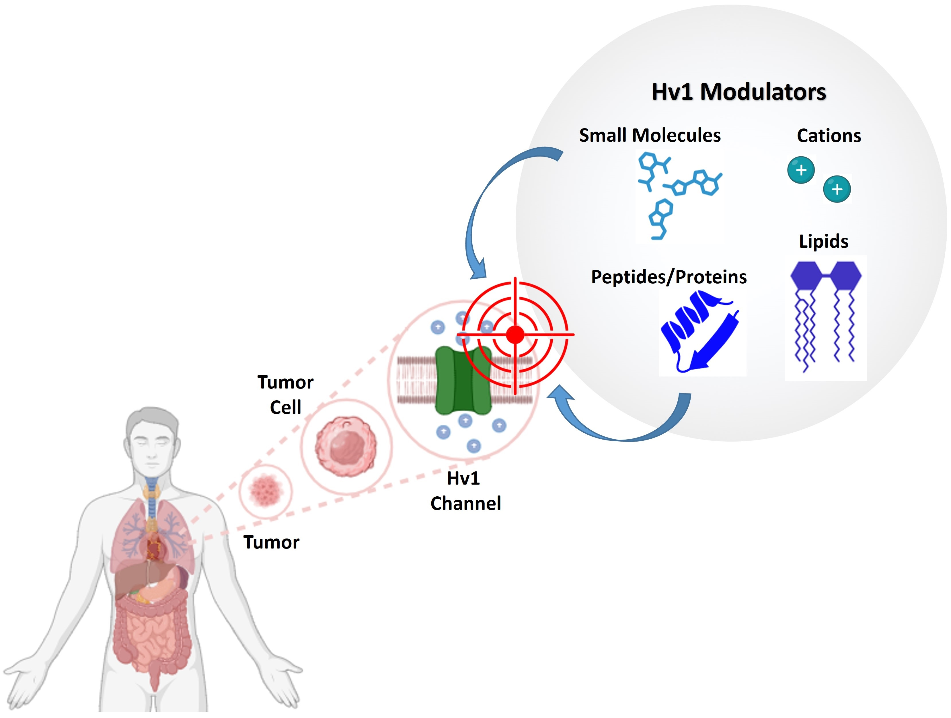 - Alvear-Arias, J.J.; Pena-Pichicoi, A.; Carrillo, C.; Fernandez, M.; Gonzalez, T.; Garate, J.A.; Gonzalez, C. Role of voltage-gated proton channel (Hv1) in cancer biology. Front. Pharmacol. 2023, 14, 1175702. [Google Scholar] [CrossRef]