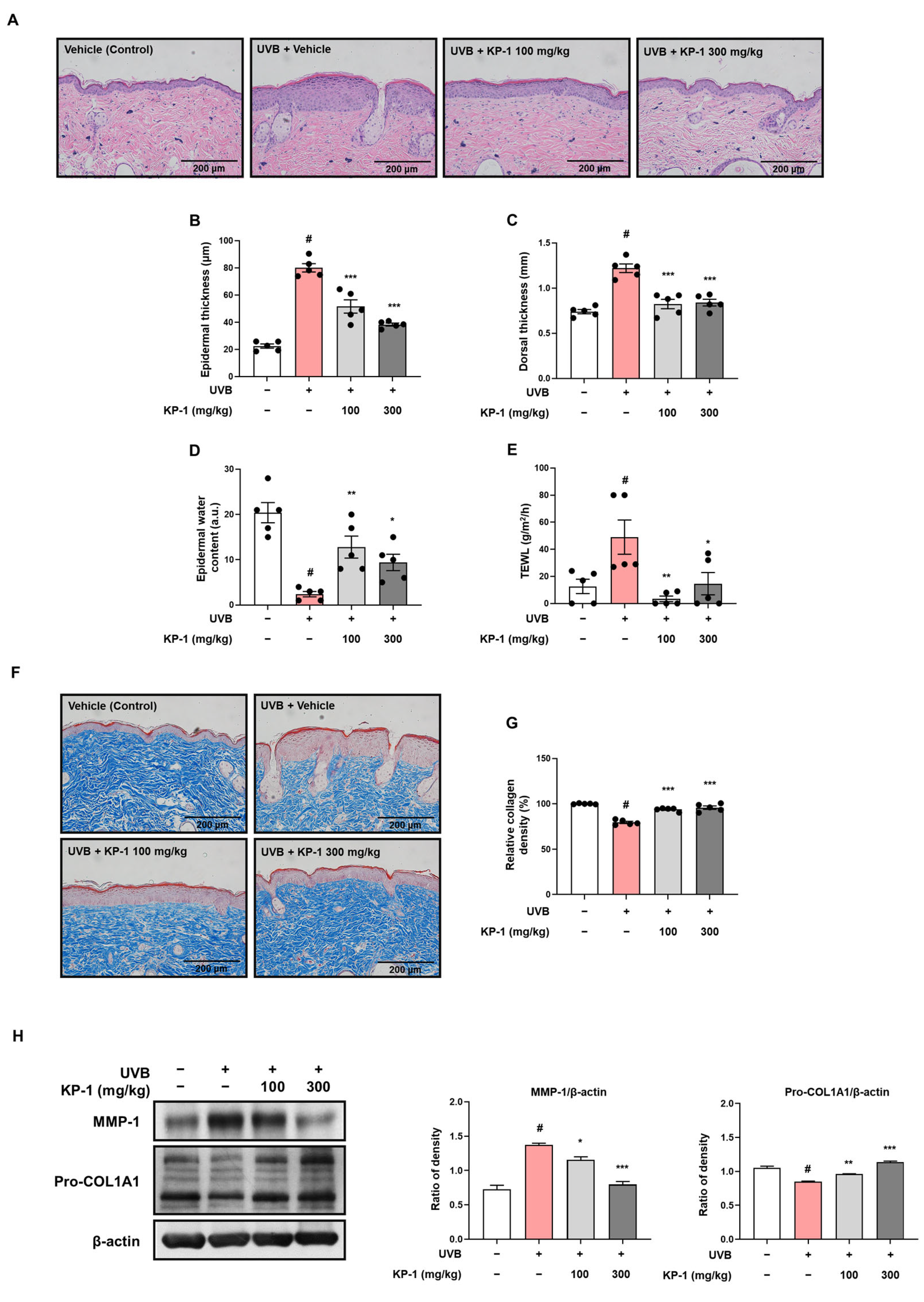 2.2. KP-1 Inhibits Wrinkle Formation in UVB-Exposed Hairless Mice