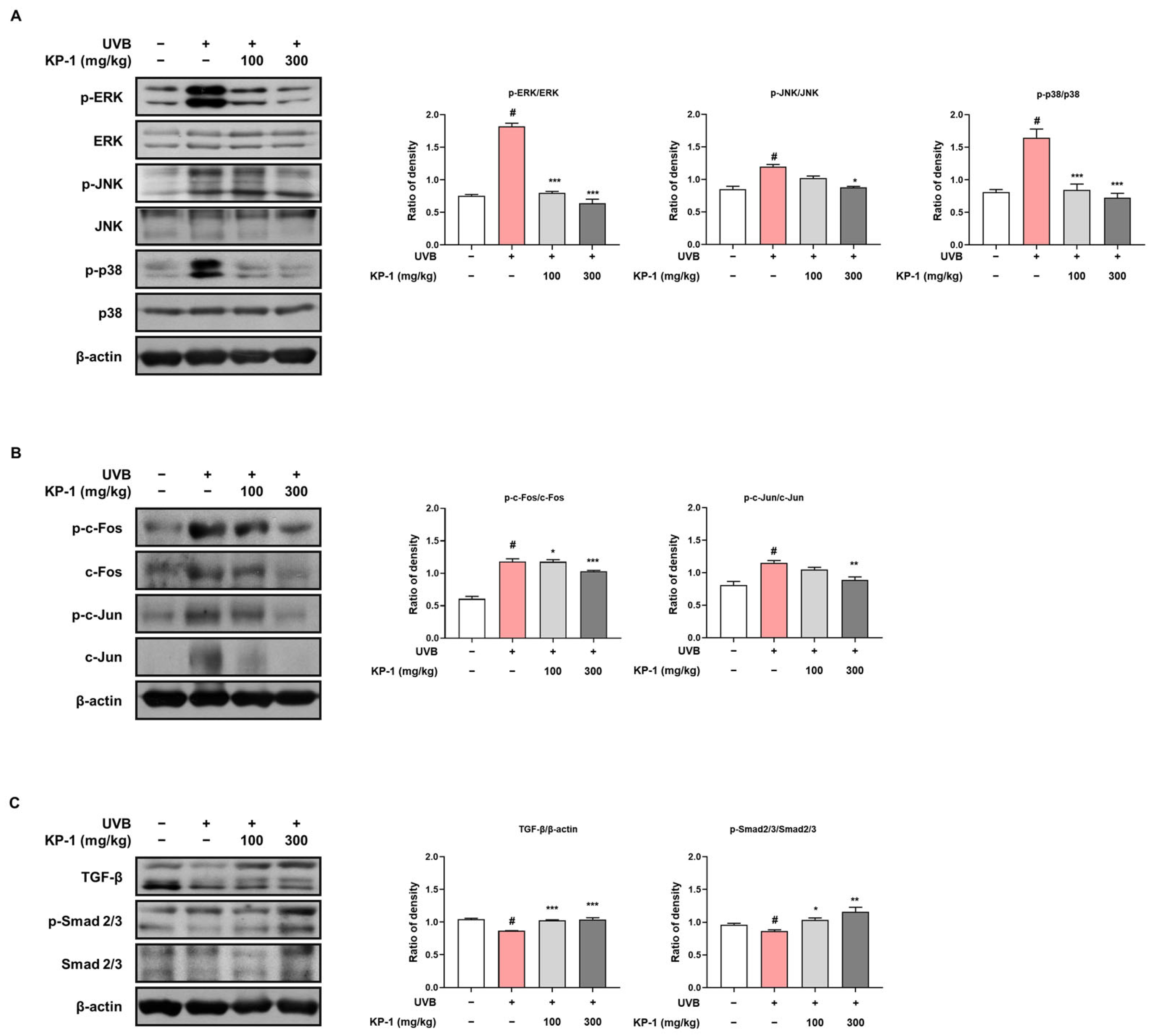 2.5. KP-1 Modulates the Activation of the MAPK/AP-1 and TGF-β/Smad2/3 Pathways Triggered by UVB