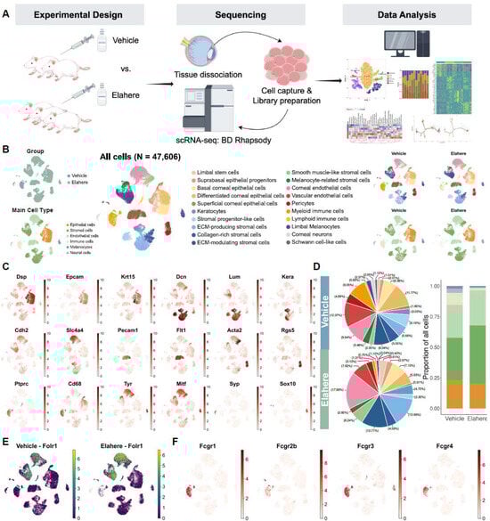 Single-cell transcriptomic landscape of the cornea reveals a heterogeneous response to Elahere treatment. (A) Overview of the experimental design and workflow for the scRNA-Seq analysis, depicting sample collection from Vehicle and Elahere-treated rats, corneal tissue processing, single-cell isolation, library preparation, sequencing, and bioinformatics analysis. (B) UMAP plot illustrating the clustering of 47,606 cells into 20 distinct cell clusters (center). The four corner insets display UMAP plots of the group distribution (top-left, Vehicle vs. Elahere), the annotated main cell types (bottom-left), and the cell-type distributions in the Vehicle and Elahere groups (top-right and bottom-right, respectively). (C) UMAP feature plots showing the expression patterns of selected canonical marker genes across all cells, emphasizing their specificity to individual cell types (e.g., Dsp and Krt15: epithelial cells; Dcn and Kera: stromal cells; Pecam1 and Cdh2: endothelial cells; Ptprc and Cd68: immune cells; Tyr: melanocytes; and Syp: neural cells). (D) Cellular composition analysis. The pie charts summarize the proportional distribution of each major cell type in the Vehicle (top) and Elahere (bottom) groups. The bar plot (far right) depicts the fold changes in cell-type proportions in the Elahere group relative to the Vehicle group, revealing shifts in major cell populations (overall changes are statistically significant, p < 0.001, Chi-squared test). The colors are consistent with panel B (main cell types). (E) UMAP feature plot illustrating Folr1 mRNA expression across all annotated corneal cell types. Folr1 levels were higher in the endothelial and some stromal clusters. (F) UMAP feature plots showing the expression of Fc gamma receptor genes (Fcgr1, Fcgr2b, Fcgr3a, and Fcgr4) in corneal cells, highlighting the predominant expression in myeloid cell clusters.