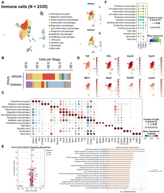 Elahere treatment significantly altered the immune cell compartment of the cornea. Re-clustering of 2335 immune cells based on well-known markers resulted in 13 distinct subsets, including monocytes, macrophages (migratory, stress-response, inflammatory, regulatory, anti-inflammatory, phagocytic, and metabolic macrophages), T/NK cells, dendritic cells, neutrophils, and mast cells (Figure 3A,C). Macrophages, the predominant immune cell type in Vehicle-treated corneas, decreased significantly in response to Elahere treatment (Figure 3B). Phagocytic macrophages, crucial for debris clearance and tissue homeostasis, were almost completely absent in the Elahere group, representing a 100% reduction from their baseline proportion within the immune cell population. Conversely, the proportion of T/NK cells slightly increased, possibly due to the relative resistance of T/NK cells to Elahere-induced depletion or a consequence of the substantial loss of other immune cell types (Figure 3B). The macrophage populations in the Elahere-treated group were enriched in pro-inflammatory markers (e.g., Tnf, Il1b, Cxcl1, and Cxcl2) compared to anti-inflammatory markers (Mrc1, Apoe, Cd163, and Lyve1) (Figure 3D).