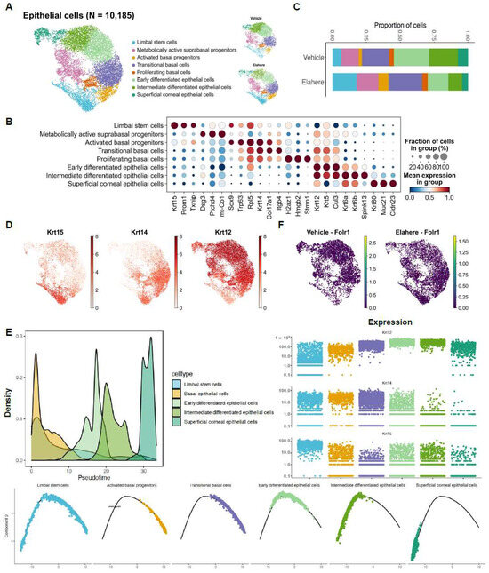 Elahere induced profound disturbances in the differentiation hierarchy of the corneal epithelium, which is essential for maintaining ocular surface integrity and vision. Re-clustering of 10,185 epithelial cells revealed eight distinct cell subsets representing a differentiation continuum from limbal stem cells (LSCs) to terminally differentiated superficial cells (Figure 4A). These subsets were annotated using canonical markers, such as high Krt15 in LSCs, Krt14 in basal cells, and Krt12 in superficial cells (Figure 4B,D). Following Elahere treatment, the cellular composition of the epithelium shifted dramatically. Progenitor populations, including LSCs and basal cells, expanded from ~45% of the epithelium in the vehicle group to ~70% in the Elahere group. Conversely, terminally differentiated superficial cells were significantly depleted, with their proportion among all epithelial cells decreasing by 35.7% (Figure 4C). This suggests a robust proliferative response combined with an arrest in differentiation.
