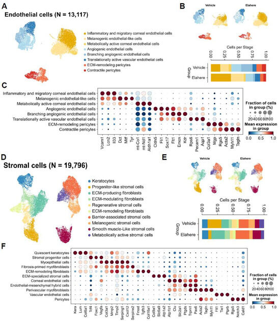 Elahere causes endothelial cell injury and pro-fibrotic stromal remodeling. (A) UMAP plot showing the re-clustering of 13,117 corneal endothelial cells from the Vehicle- and Elahere-treated groups into 8 subtypes. (B) Stacked bar plots showing the fractional proportions of each endothelial cell subtype in the Vehicle and Elahere groups. (C) Dot plot showing the expression of marker genes across the endothelial cell subtypes. The dot size and color intensity represent the fraction of cells in the subtype expressing the gene and the mean expression level, respectively. The genes include markers for inflammation (Vcam1, Lcn2), endothelial identity (Pecam1, Cdh5), angiogenesis (Kdr, Flt1), and pericyte markers (Rgs5, Acta2). (D) UMAP visualization of 19,796 re-clustered corneal stromal cells annotated into 10 subtypes, including keratocytes, progenitor-like stromal cells, ECM-producing/modulating/remodeling fibroblasts, and smooth muscle-like stromal cells. (E) Stacked bar plots showing the fractional proportion of each stromal cell subtype in the Vehicle (top) and Elahere (bottom) groups. (F) Dot plot showing the expression of marker genes, including keratocyte markers (Lum, Kera), ECM components (Col1a1), fibrosis markers (Acta2, Fn1), and progenitor cell markers, across the stromal cell subtypes. The dot size and color intensity represent the fraction of cells in the subtype expressing the gene and the mean expression level, respectively.