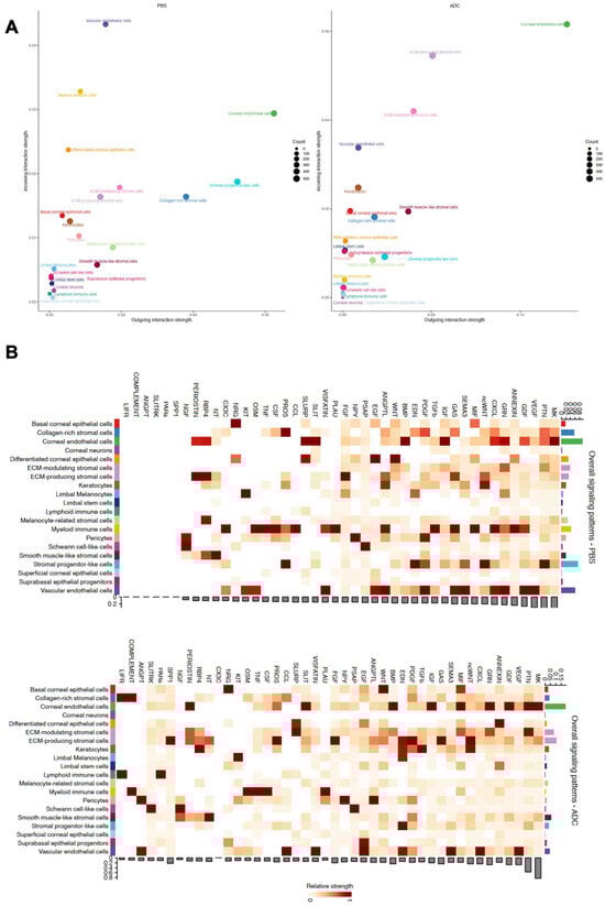 To understand how the cellular changes induced by Elahere are coordinated and propagated across different corneal compartments, intercellular communication networks were analyzed using CellChat. This analysis revealed a dramatic remodeling of signaling interactions in the various corneal cell types in response to Elahere treatment. The scatter plots of outgoing versus incoming interaction strength (Figure 6A) demonstrate a clear shift in the distribution of signaling activity for different cell types between the Vehicle (PBS, left plot) and Elahere (ADC, right plot) conditions. For instance, myeloid immune cells, which are prominent signalers in the Vehicle group with high outgoing and incoming interaction strengths, showed markedly reduced strengths in the Elahere group, consistent with their depletion. Conversely, cell types such as ECM-producing stromal cells and corneal endothelial cells appeared to adopt more significant signaling roles, particularly as senders of signals, in the Elahere-treated corneas.