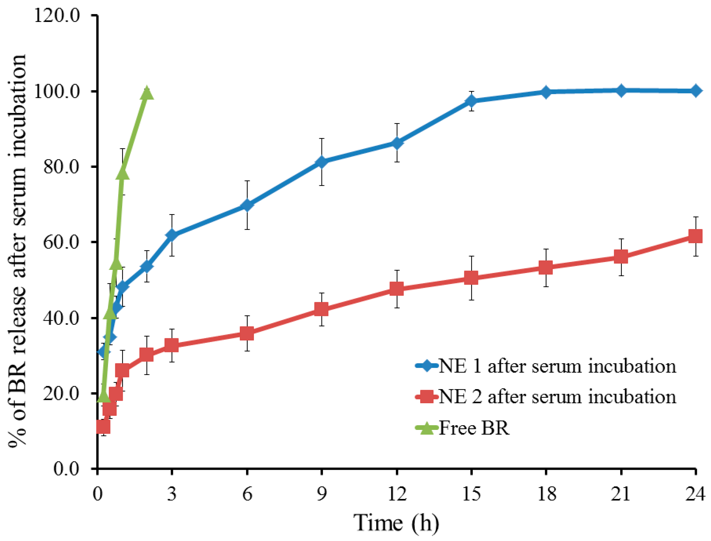 3.6. Studying In Vitro Release of BR from the Developed NE Following Serum Incubation