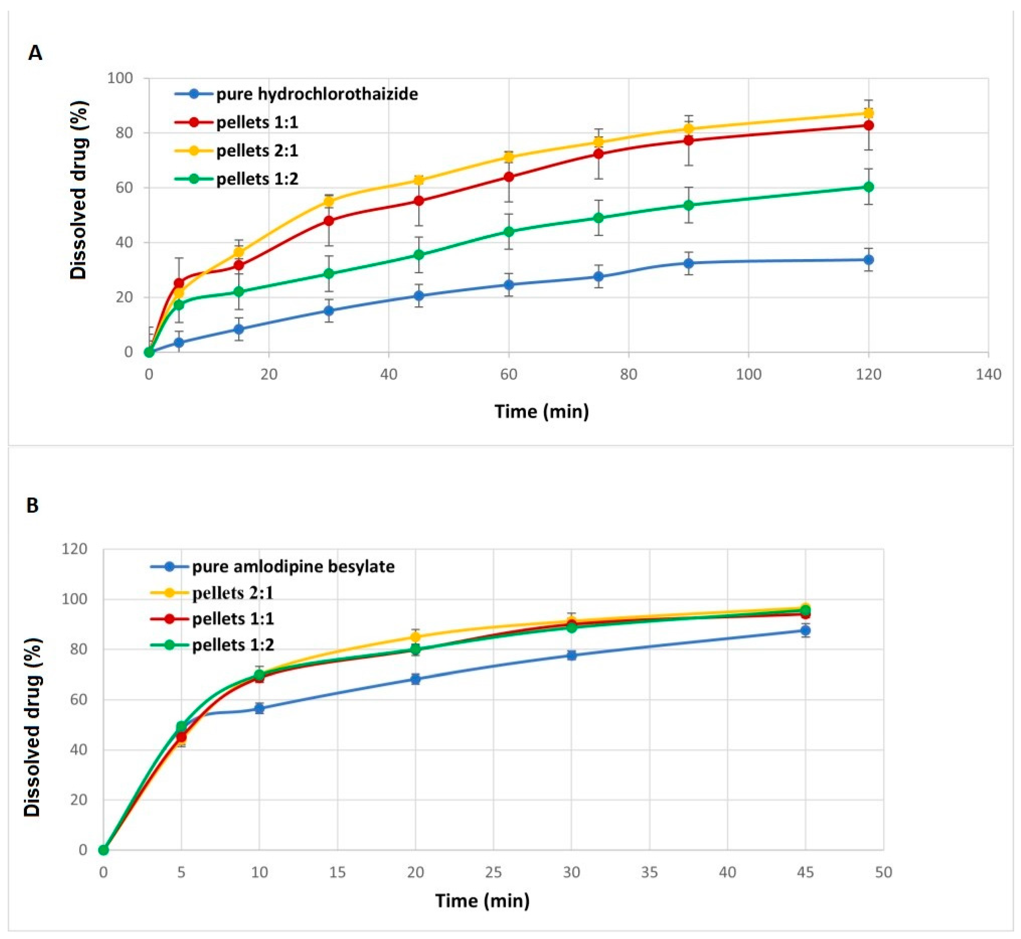 Mahmoud, A.A.K.; Ludasi, K.; Dobó, D.G.; Sebők, D.; Kukovecz, Á.; Hornok, V.; Sajdik, K.; Szabó, T.; Sovány, T.; Regdon, G., Jr.; et al. The Development and Characterization of Layered Pellets Containing a Combination of Amorphized Amlodipine Besylate and Hydrochlorothiazide Using a High-Shear Granulator. Pharmaceuticals 2025, 18, 1496. https://doi.org/10.3390/ph18101496