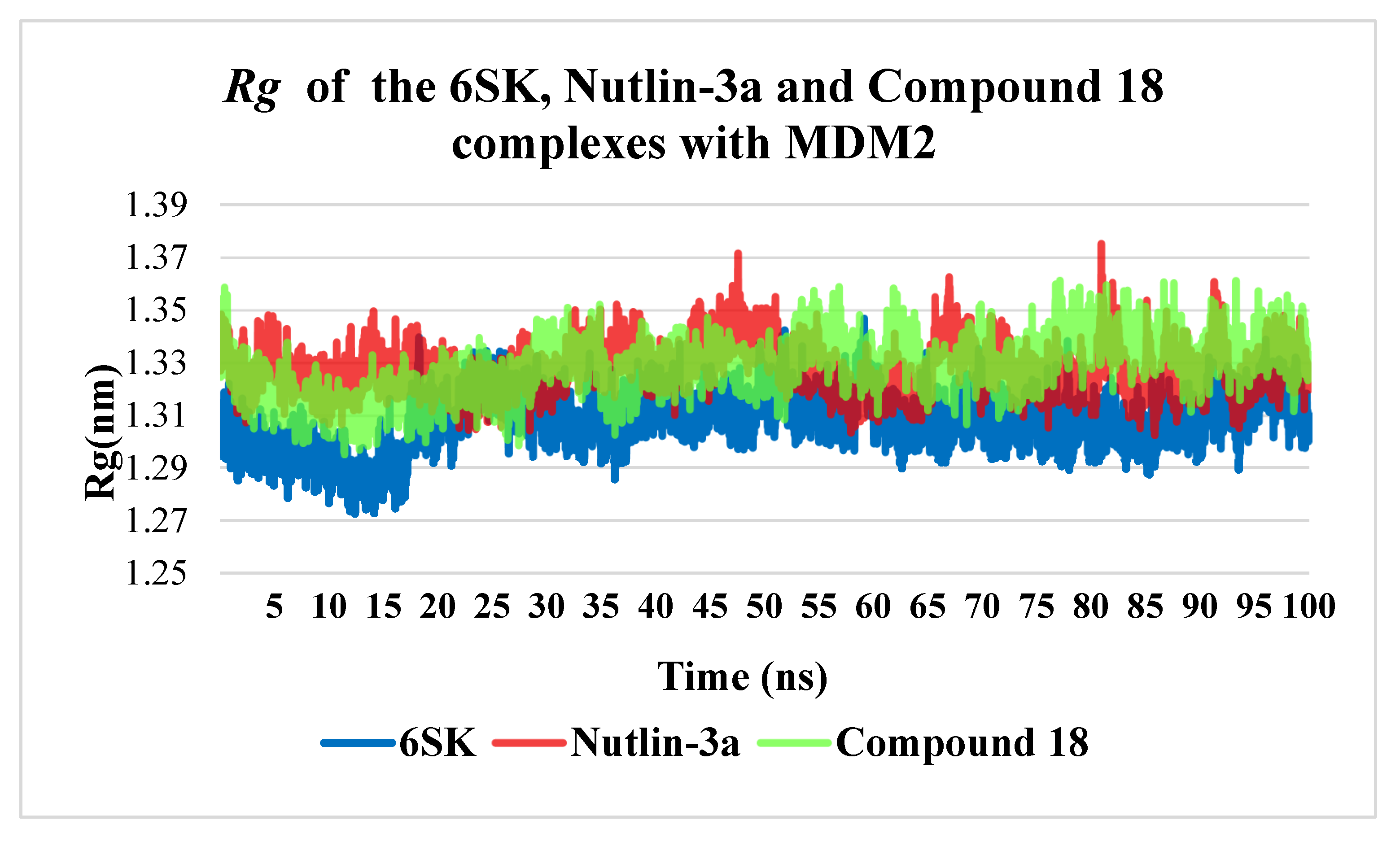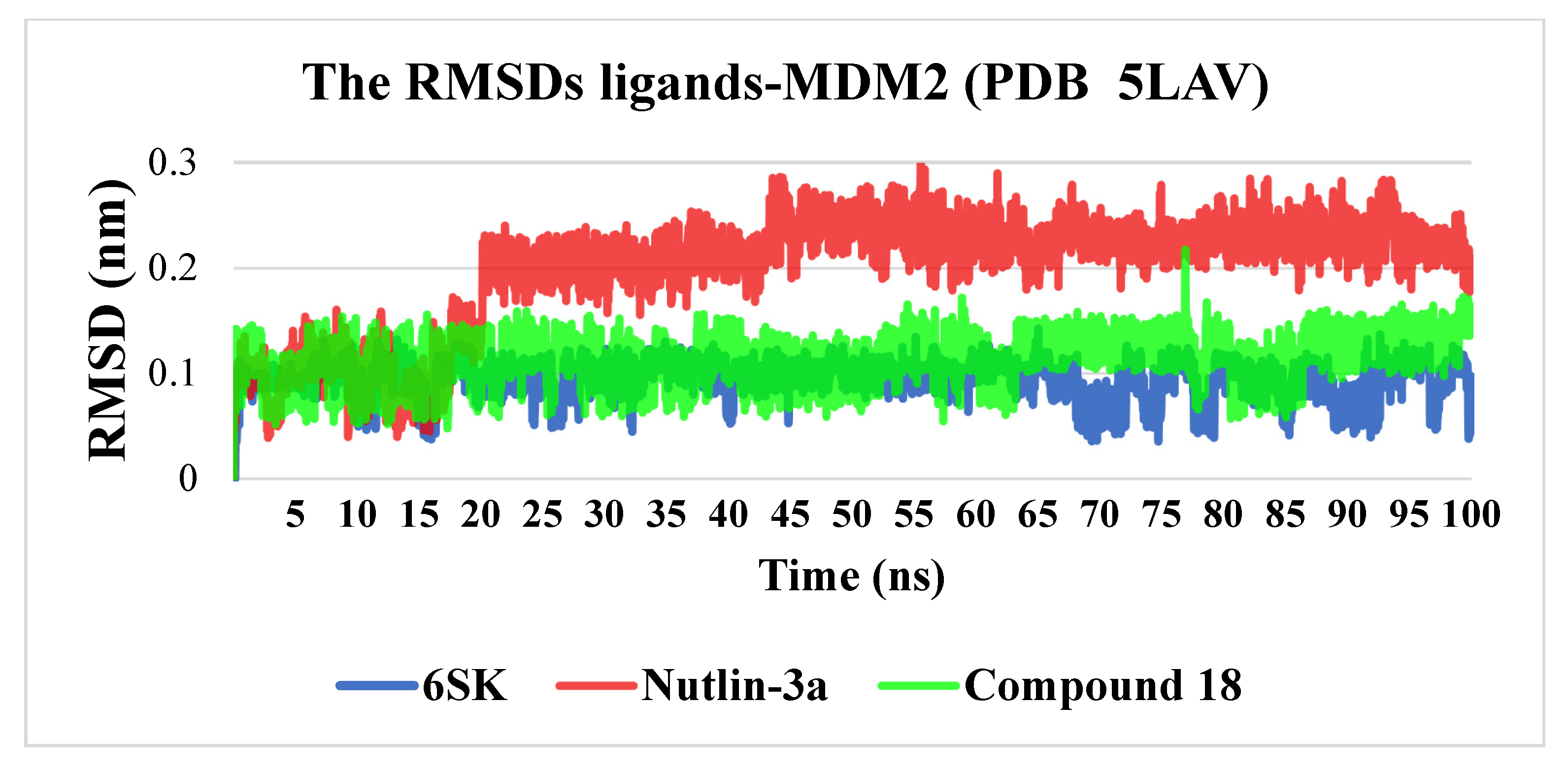 - Nutlin-3a displayed the largest excursions (0.18–0.28 nm) for most of the trajectory, reflecting partial displacement from the optimal binding pose and intermittent loss of key hydrogen bonds—behavior consistent with the higher dissociation constants reported for this chemotype.