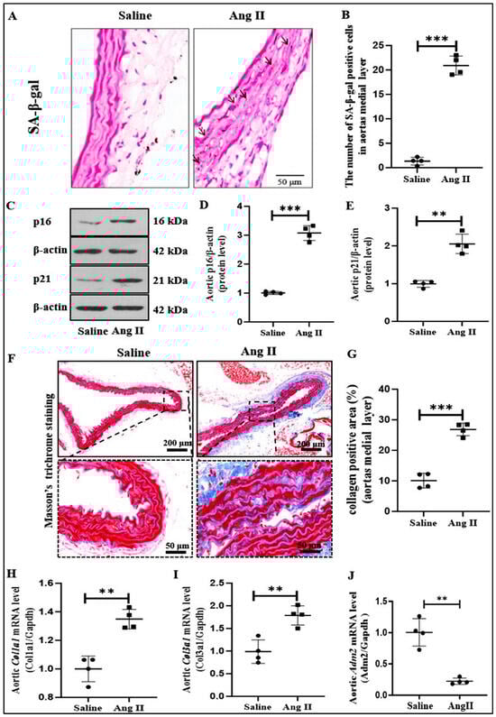 Ang II successfully induced senescent phenotype transition in tunic media of aorta in mice. SA-β-gal staining for β-galactosidase activity (blue) (scale bar = 50 μm) in the mouse thoracic aortas, and the number of positive cells of β-galactosidase-staining under the same vascular cross-sectional area ((A,B), n = 4), the arrow indicates positive staining. Western blot analysis of the protein levels of p16 and p21 and quantification ((C–E), n = 4). Masson’s trichrome staining for collagen (blue) (scale bar = 200 μm, 50 μm) in the mouse thoracic aortas, and quantification of collagen-positive staining in the medial layer ((F,G), n = 4). Quantification of Real-time PCR analysis of mRNA levels of Col1a1, Col3a1, and Adrenomedullin 2 (Adm2) in mouse aortas ((H–J), n = 4). Data are mean ± SD. ** p < 0.01, *** p < 0.001, the Mann–Whitney test.