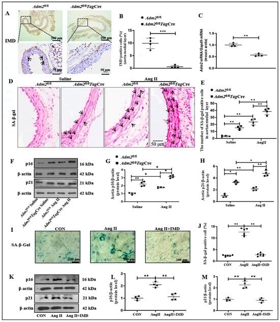 In this study, mice with initial changes in senescent phenotype transition of VSMCs in aorta of mice were constructed by Ang II subcutaneous buried pump [17,18]. First, the changes in senescent markers in senescence-associated β-galactosidase (SA-β-gal) activity and protein levels of cyclin-dependent kinase inhibitors p16 and p21 in the aorta of mice were detected. Compared to controls, Ang II-induced membrane SA-β-gal activity was significantly higher in mouse aorta (Figure 1A,B), and protein levels of p16 and p21 were also significantly increased (Figure 1C–E). Vascular fibrosis is one of the features of vascular aging [19], and the area of Ang II-induced aortic fibrosis was significantly increased in mice compared with controls (Figure 1F,G). Real-time PCR results also showed that the aortic mRNA levels of Col1a1 and Col3a1 were significantly higher in Ang II-treated mice than in the control group (Figure 1H,I). In conclusion, Ang II-induced senescent phenotype transition of VSMCs in aorta as shown by the increased activity of aging-related markers SA-β-gal, protein levels of p16 and p21 proteins, and fibrosis in aorta of mice, indicated that the senescent phenotype transition of VSMCs in aorta was successfully constructed. Moreover, the mRNA level of IMD, namely Adm2, in the aortic tunic media of the Ang II-treated group was significantly decreased when compared with the control group (Figure 1J), suggesting that IMD may be involved in the pathogenesis of aortic aging induced by Ang II.