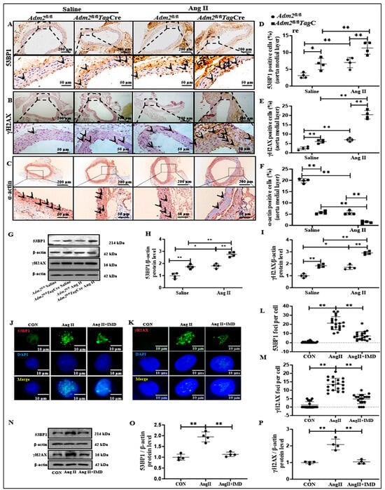 DNA damage is one of the most important causes of vascular aging [6]. The inhibitory effect of IMD on Ang II-induced vascular senescent phenotype transition may be achieved by alleviating DNA damage. We explored the effects of IMD on DNA damage in the Ang II-induced mouse vascular senescent phenotype transition model. Both p-H2A histone family member X (S139) (γH2AX) and p53-binding protein 1 (53BP1) are widely used biomarkers of DNA damage [20,21]. Immunohistochemistry results showed that Ang II treatment significantly elevated the protein levels of 53BP1 and γH2AX in Adm2fl/fl mice, and this effect was further strengthened in Adm2fl/flTagCre mice (Figure 4A,B,D,E). Moreover, the increased protein levels of 53BP1 and γH2AX in the arteries of Adm2fl/flTagCre mice were confirmed by Western blot (Figure 4G–I), suggesting that IMD deficiency aggravated DNA damage in mouse aortas. In addition, the protein expression of α-actin of VSMCs phenotype was decreased in Adm2fl/fl mice, and this decrease was more significant in Adm2fl/flTagCre mice after Ang II treatment (Figure 4C,F). This further indicated that the VSMCs in the arterial media underwent a phenotypic transformation.