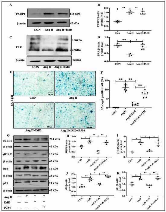 Pharmaceutical inhibition of PARP1 blocked the inhibitory effects of IMD on DNA damage in VSMCs treated by Ang II. Western blot analysis of PARP1 protein level in mouse VSMCs, and quantification ((A,B), n = 4). Data are mean ± SD. ns, no significance. The Kruskal–Wallis test. Western blot analysis of the protein level of poly (ADP-ribose) polymer (PAR) in mouse VSMCs and quantification ((C,D), n = 4). * p < 0.05, ** p < 0.01, the Kruskal–Wallis test. SA-β-gal staining for β-galactosidase activity (blue) (scale bar = 100 μm) in mouse VSMCs, and quantification of SA-β-gal-positive staining in mouse VSMCs ((E,F), n = 6). Data are mean ± SD. ** p < 0.01, one-way ANOVA (F). Western blot analysis of the protein levels of p16, p21, 53BP1 and γH2AX in mouse VSMCs, and quantification ((G–K), n = 4). Data are mean ± SD. * p < 0.05, ** p < 0.01, the Kruskal–Wallis test.