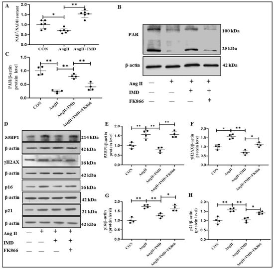 Inhibition of NAMPT blocked the effect of IMD on increasing PARP1 activity in VSMCs treated by Ang II. Quantification of NAD+/NADH in mouse VSMCs induced by Ang II and IMD1-53 ((A), n = 4). Data are mean ± SD. * p < 0.05, ** p < 0.01, one-way ANOVA. Western blot analysis of the protein level of PAR in mouse VSMCs and quantification ((B,C), n = 4). Data are mean ± SD. ** p < 0.01, the Kruskal–Wallis test. Western blot analysis of 53BP1, γH2AX, p16 and p21 protein levels in mouse VSMCs, and quantification ((D–H), n = 4). Data are mean ± SD. * p < 0.05 and ** p < 0.01, the Kruskal–Wallis test.
