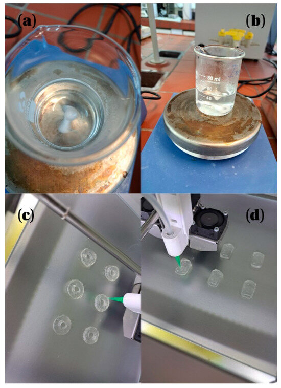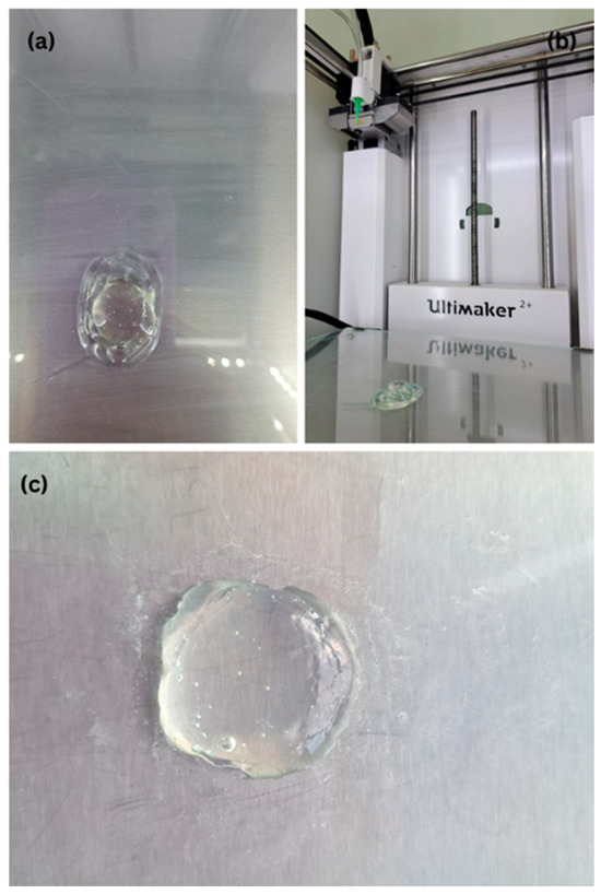 The printability of each polymer–solvent–excipient mixture was evaluated through qualitative observations during and after extrusion. Key parameters included the homogeneity of the mixture, flow behavior, the presence and persistence of air bubbles, extrusion smoothness, and the dimensional stability of printed constructs. Formulations that exhibited excessive spreading, interlayer detachment, or nozzle clogging were deemed unsuitable for semi-solid extrusion (SSE). Furthermore, formulations that produced irregular lines or collapsed structures during layer deposition were identified as having insufficient plasticity or cohesion.