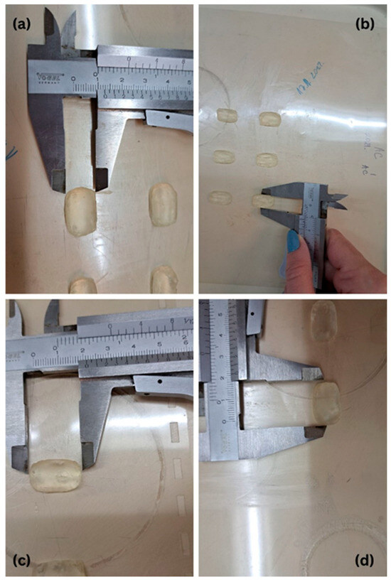 Three-dimensional-printed rectangle-shaped tablets F1 measured using a digital caliper: (a,c) width, (b,d) length.