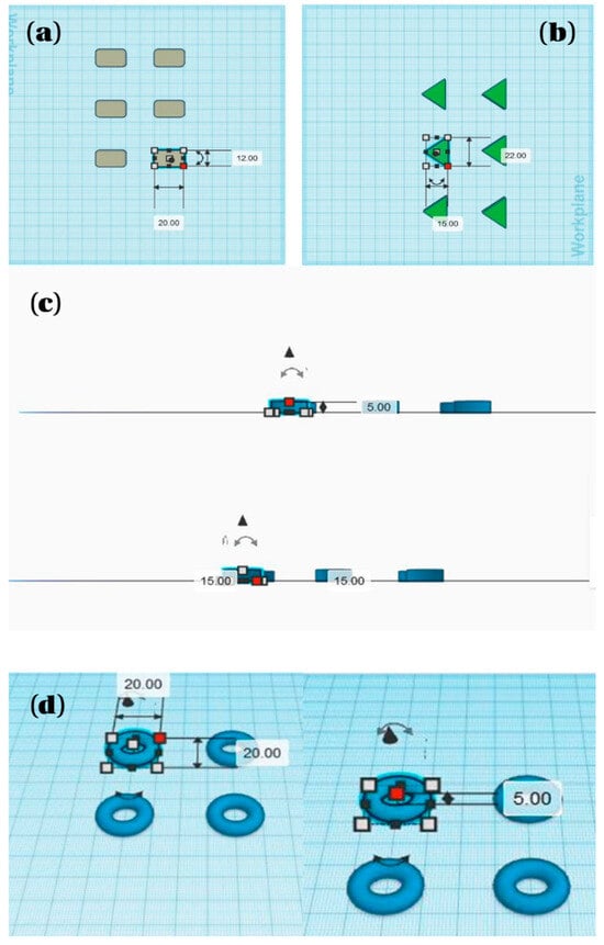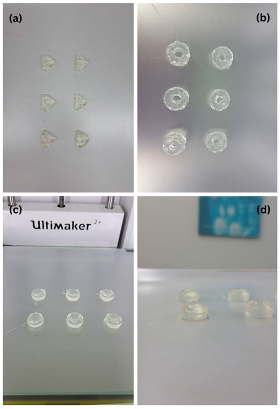 Three-dimensional-printed tablets (various shapes): (a) triangle shape, (b) doughnut shape, (c,d) round shape.