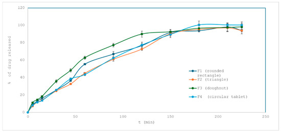The drug release profiles of losartan potassium from different tablet geometries (rounded rectangle, triangle, doughnut, and circle) were analyzed to assess the impact of shape on dissolution behavior and presented in Figure 1. Although the formulation composition remained constant (F1–F4), the surface area and volume varied depending on the geometry, potentially influencing drug release dynamics.