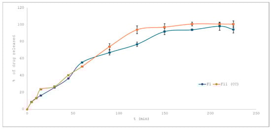 As shown in Figure 6, both profiles exhibit gradual drug release beyond 120 min, F11 reached nearly complete drug release (100.78%), while F1 plateaued at 94.30% after 225 min. The calculated similarity factor (f2 = 58.91) indicates that the two profiles are similar (f2 > 50), though the presence of 1% croscarmellose sodium had a slight impact on enhancing release kineticsin the later stages of dissolution.