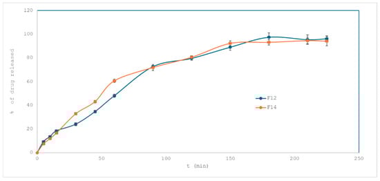 In the second comparison (Figure 7), F12 and F14—both with a reduced drug loading of 5% were evaluated. These formulations differed in the concentration of croscarmellose sodium: 3% in F12 and 1% in F14. As illustrated in Figure 6, F14 exhibited faster drug release in the first 60 min. However, after this point, both profiles converged, reaching similar levels of cumulative release by the end of the test (96.23% for F12 and 94.23% for F14). The calculated f2 value of 63.77 confirms high similarity, indicating that increasing the superdisintegrant concentration beyond 1% did not proportionally enhance the release rate, suggesting a plateau effect in its impact within this system.