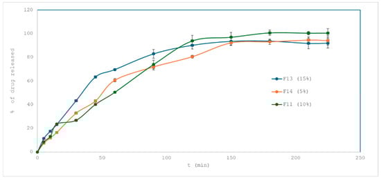 Drug release from formulations F13 (15% of drug loading), F14 (5%) and F11 (10%).