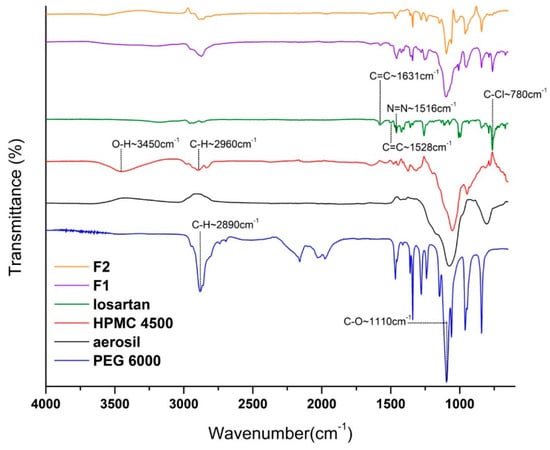 Samples analyzed included powdered 3D-printed tablets, pure losartan potassium, and individual excipients. Spectra were collected over a wavenumber range of 4000–650 cm−1 at a resolution of 2 cm−1. The presence or absence of characteristic peaks, as well as any peak shifts, were used to evaluate possible intermolecular interactions or structural changes upon formulation.