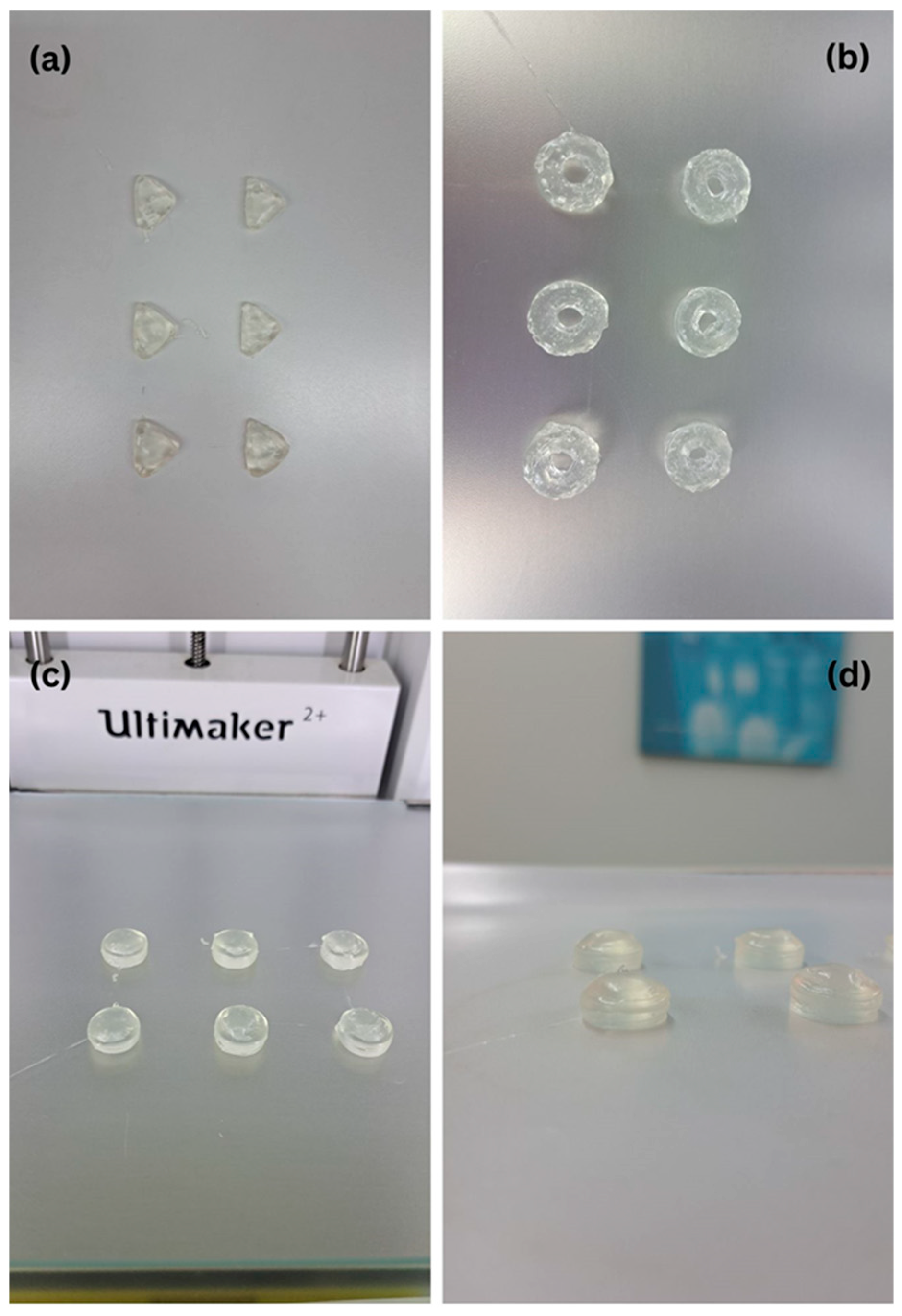 - Infill Density and Pattern: A 100% infill density and linear pattern were chosen to ensure mechanical integrity and prevent internal collapse, particularly during solvent loss. These settings also support reproducible drug release by minimizing porosity variation.