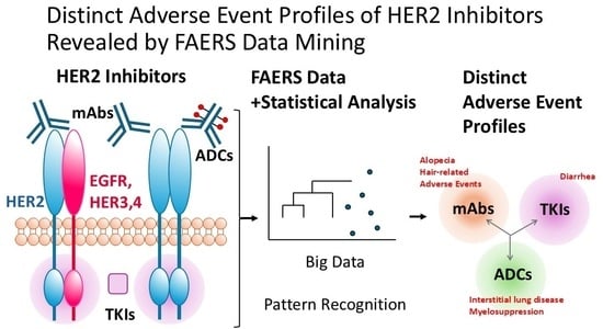- Bao, Y.; Chen, J.; Duan, L.; Wang, F.; Lai, H.; Mo, Z.; Zhu, W. Comparing the difference of adverse events with HER2 inhibitors: A study of the FDA adverse event reporting system (FAERS). Front. Pharmacol. 2024, 15, 1288362. [Google Scholar] [CrossRef] [PubMed]