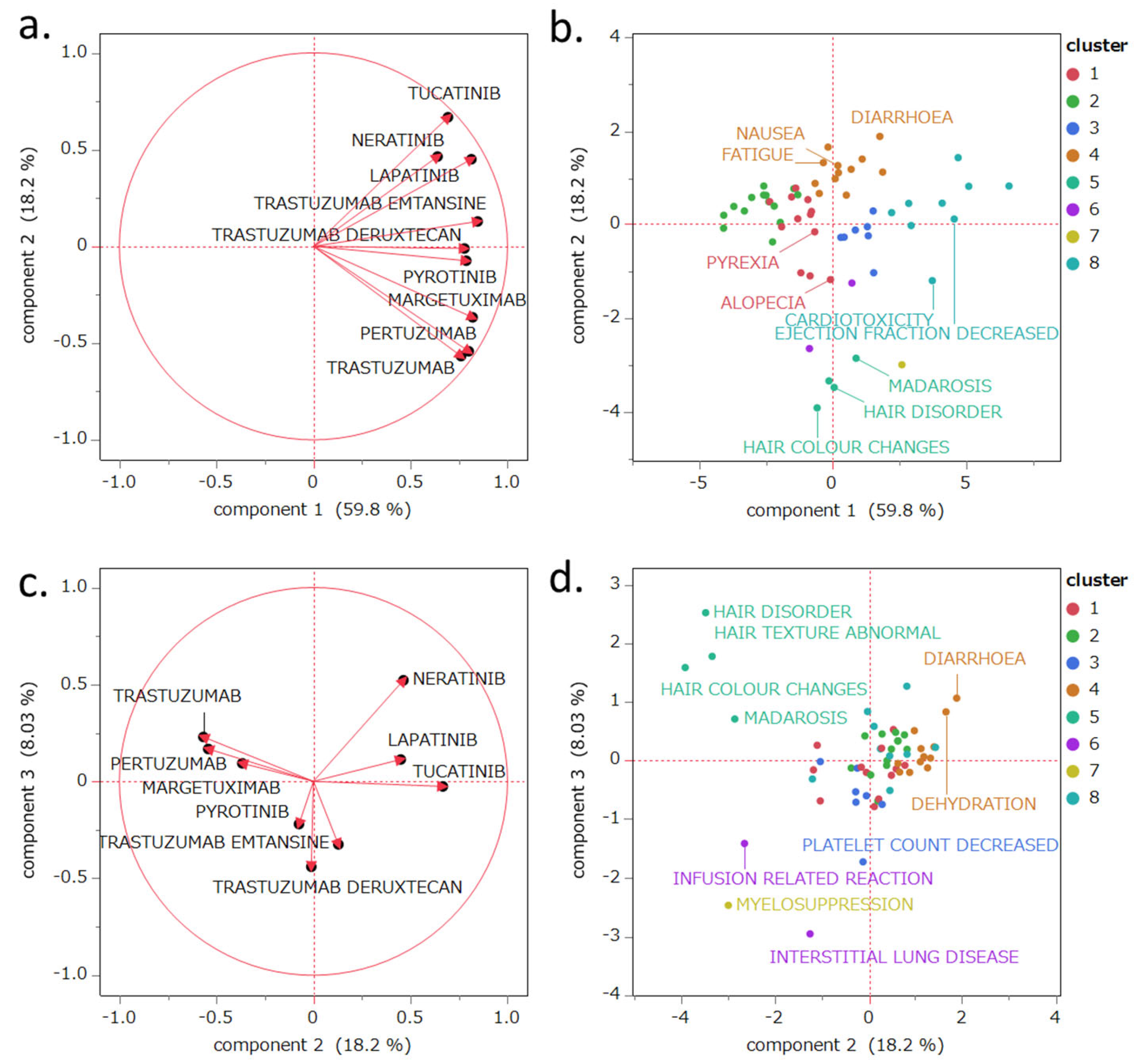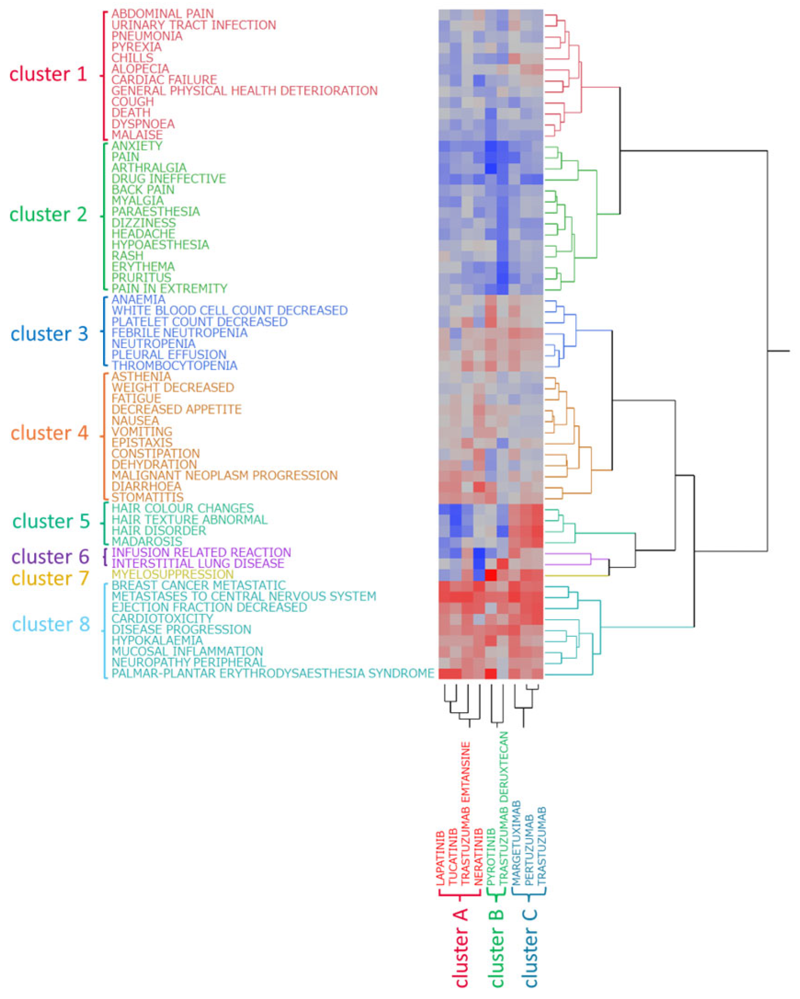 - Cluster 8: breast cancer metastatic, cardiotoxicity, disease progression, decreased ejection fraction, hypokalemia, metastases to the central nervous system, mucosal inflammation, peripheral neuropathy, and palmar–plantar erythrodysesthesia syndrome
