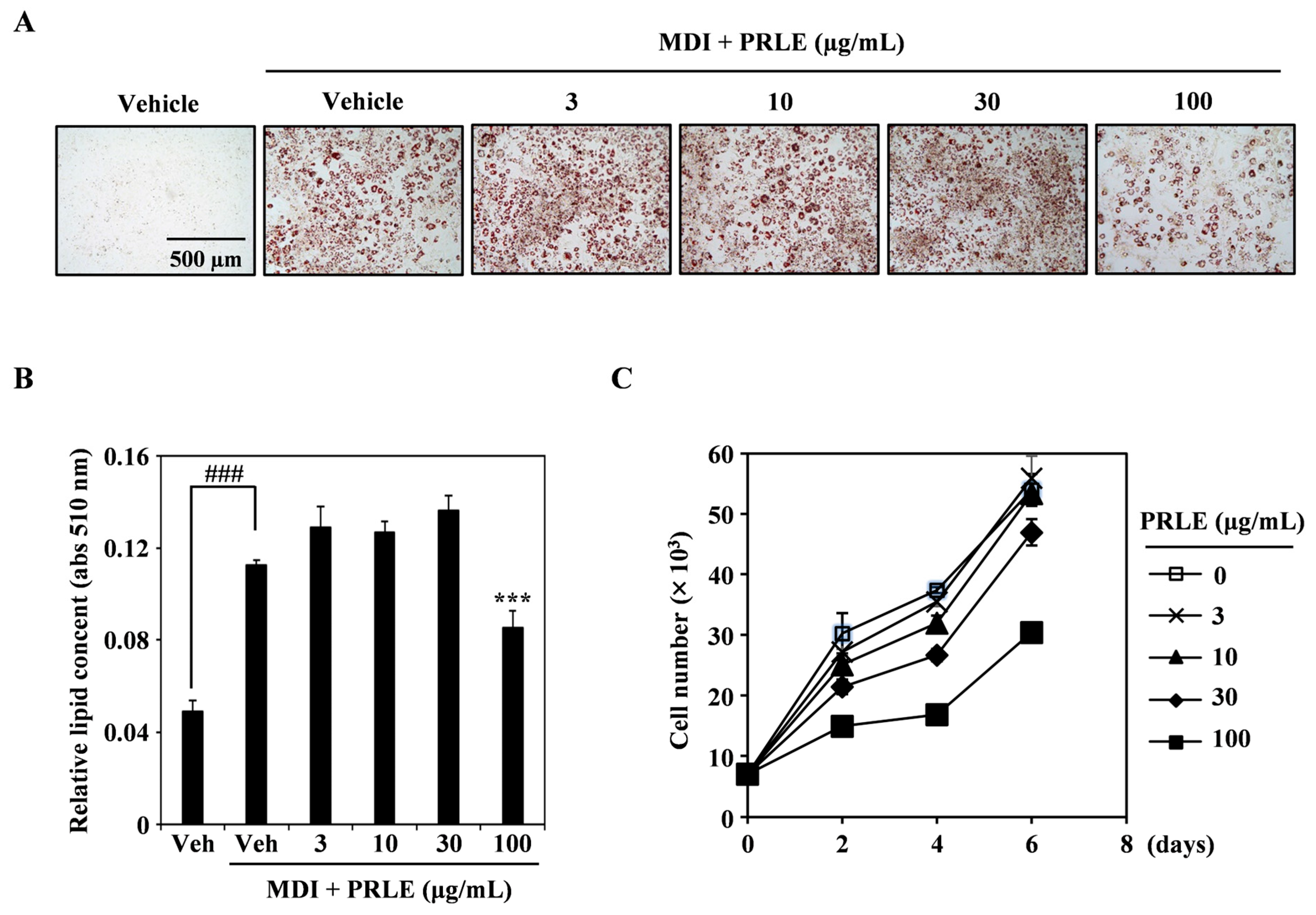 2.1. PRLE Inhibits Lipid Accumulation in 3T3-L1 Adipocytes