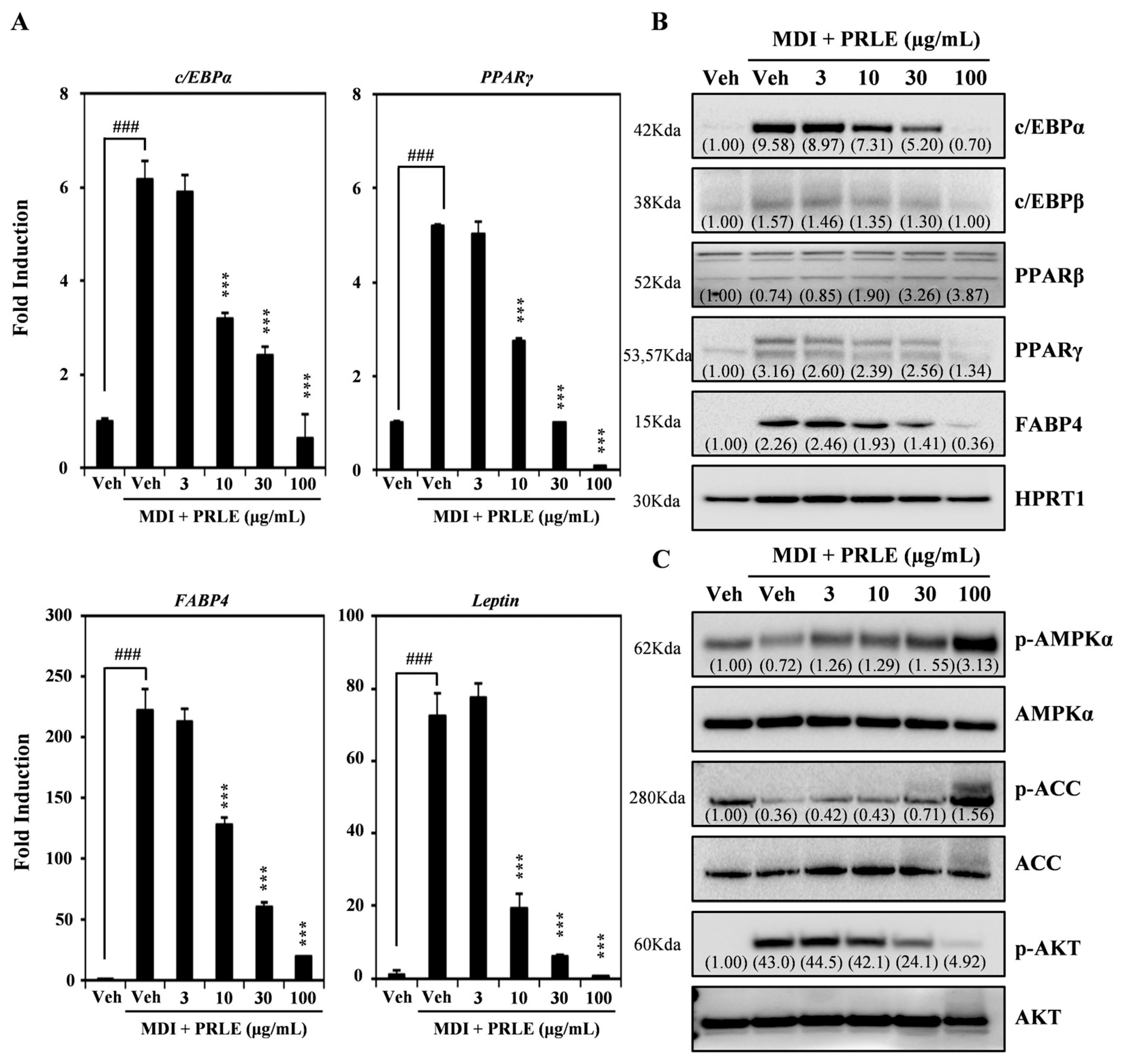 2.2. PRLE Decreases the Expression of Molecular Markers Associated with Adipose Differentiation of 3T3-L1 Cells