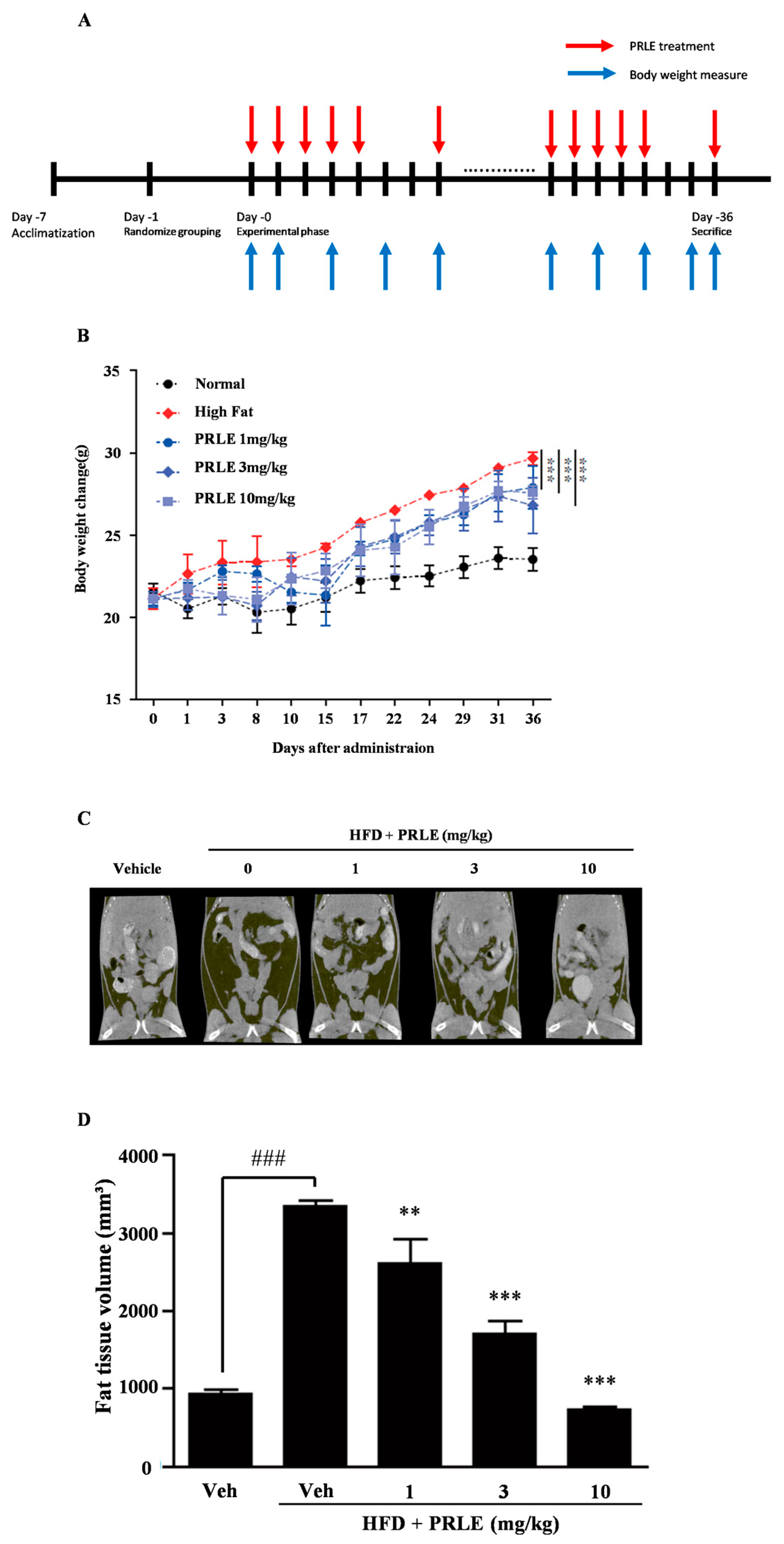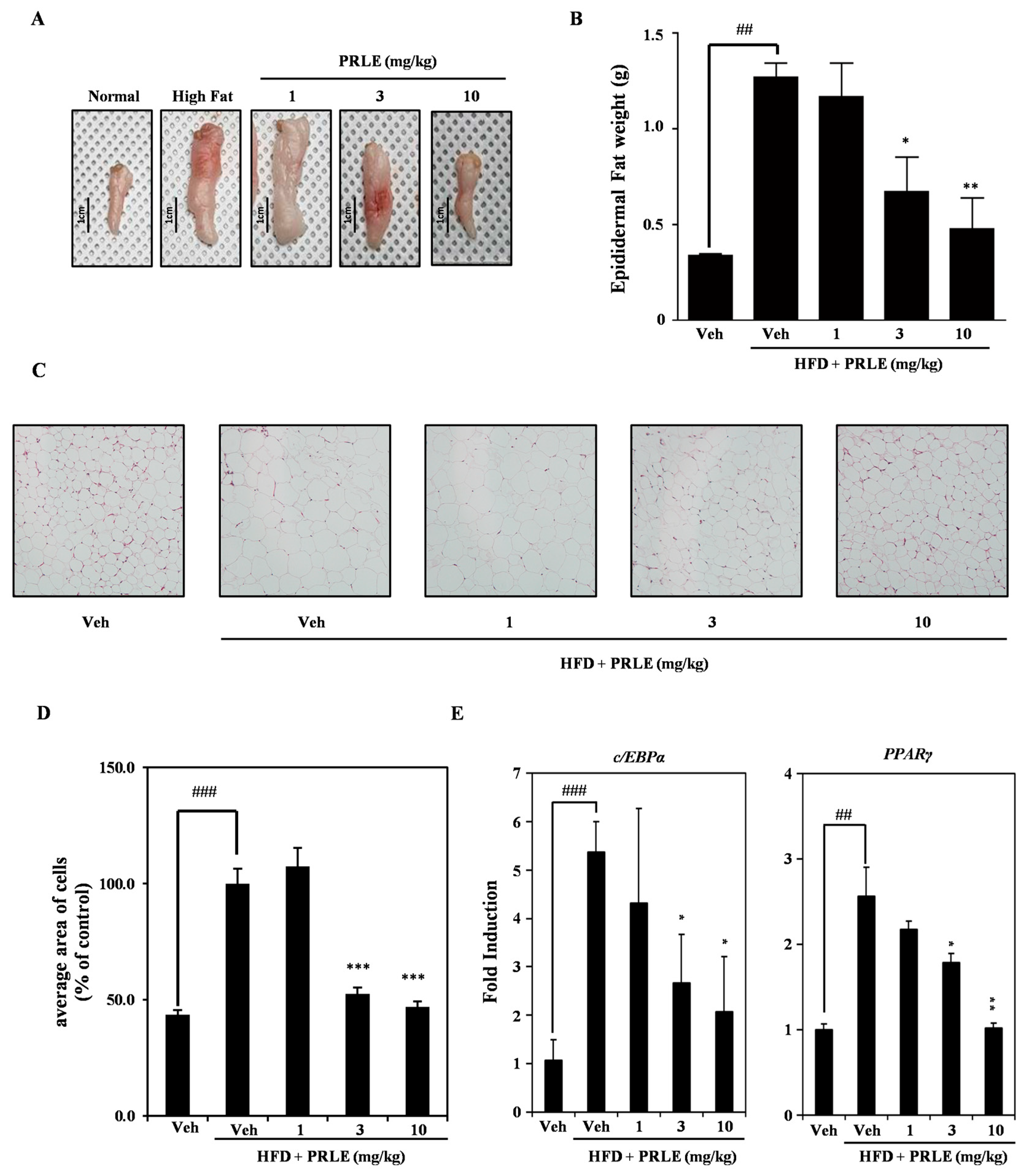 2.3. PRLE Inhibits Body Weight Gain and Reduces Body Fat in HFD-Fed Mice