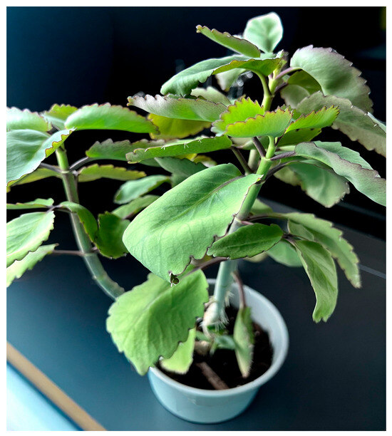 K. pinnata (Lam.) Pers., a member of the Crassulaceae family, is widely recognized for its medicinal uses across Africa, Asia, and South America. This perennial plant typically grows to a height of 1–1.5 m and features a moist, sturdy, tuberous, hairless stem. Its leaves are thick, simple, and lobed (3 to 5 lobes), while its drooping orange-red flowers are a distinctive feature. Notably, the plant produces vegetative buds—small reddish leaflets—along the leaf margins and stems, which can develop into new plants (Figure 1) [4]. K. pinnata is the most widely used species in its genus and has long been integral to traditional and holistic medicine worldwide [5]. It has been employed to treat a wide range of ailments, including wounds, cancer, urolithiasis, hypertension, diabetes, diarrhea, vomiting, respiratory and urinary tract infections, coughs, dysentery, migraines, and rheumatoid disorders [6,7,8,9]. Aqueous extracts from the leaves and roots are commonly used in traditional medicine for disease therapy in many regions, including the treatment of diabetes. The plant is known by various names—such as “miracle plant”, “air plant”, “life plant”, “master herb”, “cure-all”, and “best of luck leaves” reflecting its esteemed status in folk medicine [9,10].
