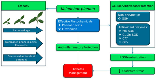 The therapeutic potential of K. pinnata in diabetes management, attributed to its antioxidant and anti-inflammatory properties. As the plant ages, levels of phenolic acids and flavonoids decline, resulting in a reduced antioxidant and anti-inflammatory potential and overall efficacy. Antioxidant protection involves both non-enzymatic (GSH) and enzymatic systems (Mn-SOD, Cu, Zn-SOD, CAT, GPx), which collectively neutralize reactive oxygen species (ROS) and reduce oxidative stress. These mechanisms ultimately support better diabetes management by mitigating oxidative damage and inflammation. (↓ denotes decrease).