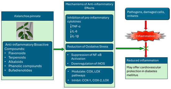 Inflammation is a complex biological response to harmful stimuli, including pathogens, damaged cells, and irritants. Chronic inflammation is associated with various diseases, including arthritis, diabetes, and cardiovascular disorders. Natural compounds from medicinal plants have gained attention for their potential role in modulating inflammatory pathways. Kalanchoe pinnata has been traditionally used to treat inflammation-related conditions. The bioactive compounds responsible for the anti-inflammatory activity of K. pinnata include flavonoids, terpenoids, alkaloids, phenolic compounds, and bufadienolides. These secondary metabolites exhibit potent anti-inflammatory effects by inhibiting pro-inflammatory mediators and oxidative stress [47]. The anti-inflammatory effects of K. pinnata are attributed to multiple mechanisms, including the inhibition of pro-inflammatory cytokines (Figure 4). Studies indicate that K. pinnata extracts reduce levels of key cytokines such as TNF-α, IL-1β [26,48], and IL-6 [34,35] (Table 2), which are involved in inflammatory signaling. The plant extract has also been found to modulate the cyclooxygenase (COX) and lipoxygenase (LOX) pathways and inhibit cyclooxygenase-1 (COX-1) and cyclooxygenase-2 (COX-2) [11,49] and LOX enzymes, reducing the synthesis of inflammatory prostaglandins and leukotrienes. The flavonoids and phenolic compounds also contribute to reducing oxidative stress, a notable factor in chronic inflammation. K. pinnata has been reported to suppress the activation of NF-κB, a transcription factor that regulates the expression of pro-inflammatory genes. The extracts also downregulate inducible nitric oxide synthase (iNOS), limiting excessive NO production and contributing to inflammatory damage. Aging and diabetes are associated with elevated systemic levels of IL-1β, TNF-α, and IL-6 [50]. Pro-inflammatory cytokines, such as TNF-α and IL-1β, contribute to atherosclerosis by inducing the expression of E-selectin, intercellular adhesion molecule 1 (ICAM-1), and vascular cell adhesion molecule 1 (VCAM-1) in endothelial cells [51]. Kong et al. [52] identified IL-1β and TNF-α as key mediators in the initiation and progression of atherosclerosis. Conversely, Menon et al. [34] (Table 2) reported elevated IL-1β and TNF-α levels in diabetic rats administered an aqueous K. pinnata preparation, indicating that it may not effectively mitigate the risk of atherosclerosis.