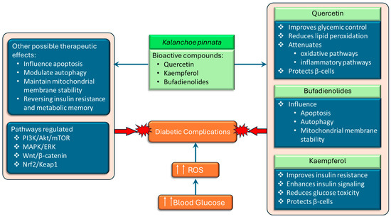 The schematic representation of the potential therapeutic effects of Kalanchoe pinnata bioactive compounds, quercetin, kaempferol, and bufadienolides, which exert protective effects by targeting multiple mechanisms. Quercetin improves glycemic control, suppresses oxidative and inflammatory pathways, and protects pancreatic β-cells. Kaempferol enhances insulin signaling, reduces glucose toxicity, and protects β-cells. Bufadienolides influence apoptosis, autophagy, and mitochondrial membrane stability. Collectively, these compounds modulate key signaling pathways (PI3K/Akt/mTOR, MAPK/ERK, Wnt/β-catenin, and Nrf2/Keap1) and may offer additional therapeutic benefits, including the reversal of insulin resistance, modulation of metabolic memory, and stabilization of mitochondrial function (↑↑ denotes increase).