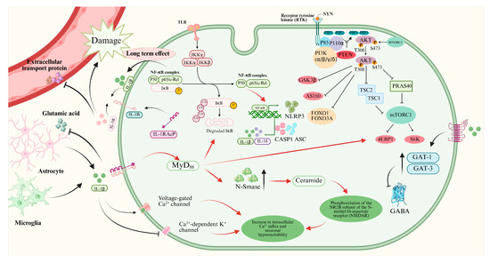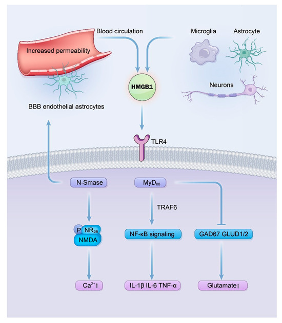 Furthermore, HMGB1 demonstrated similar damage effects to the blood–brain barrier as IL-1β. HMGB1 can directly bind to TLR4 in the endothelial cells and astrocytes of the blood–brain barrier and induces circling albumin to invade the microenvironment of the brain, which aggravates the neuroinflammation by activating astrocytes [84,85].