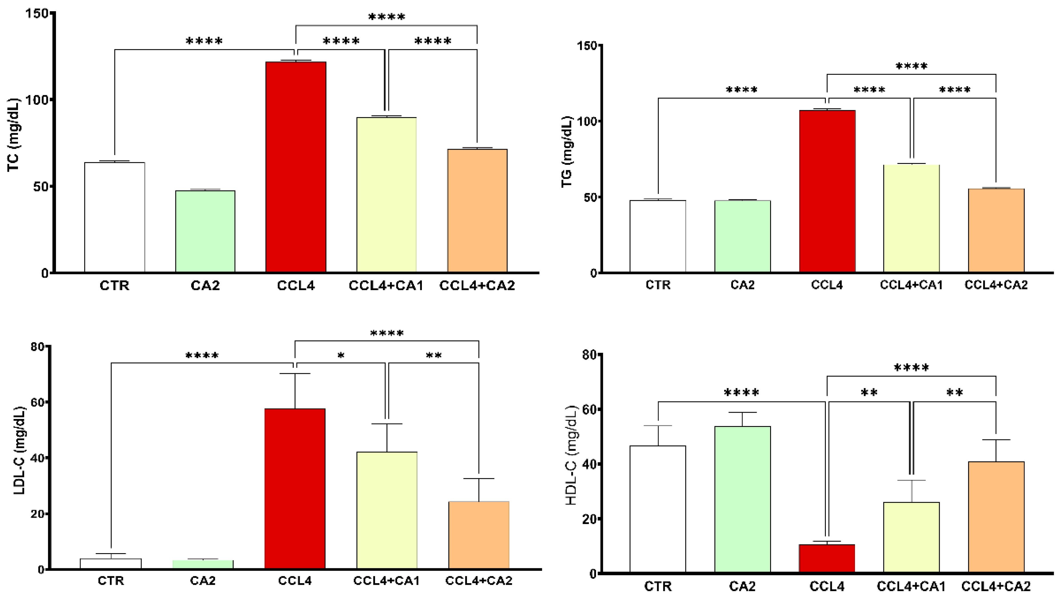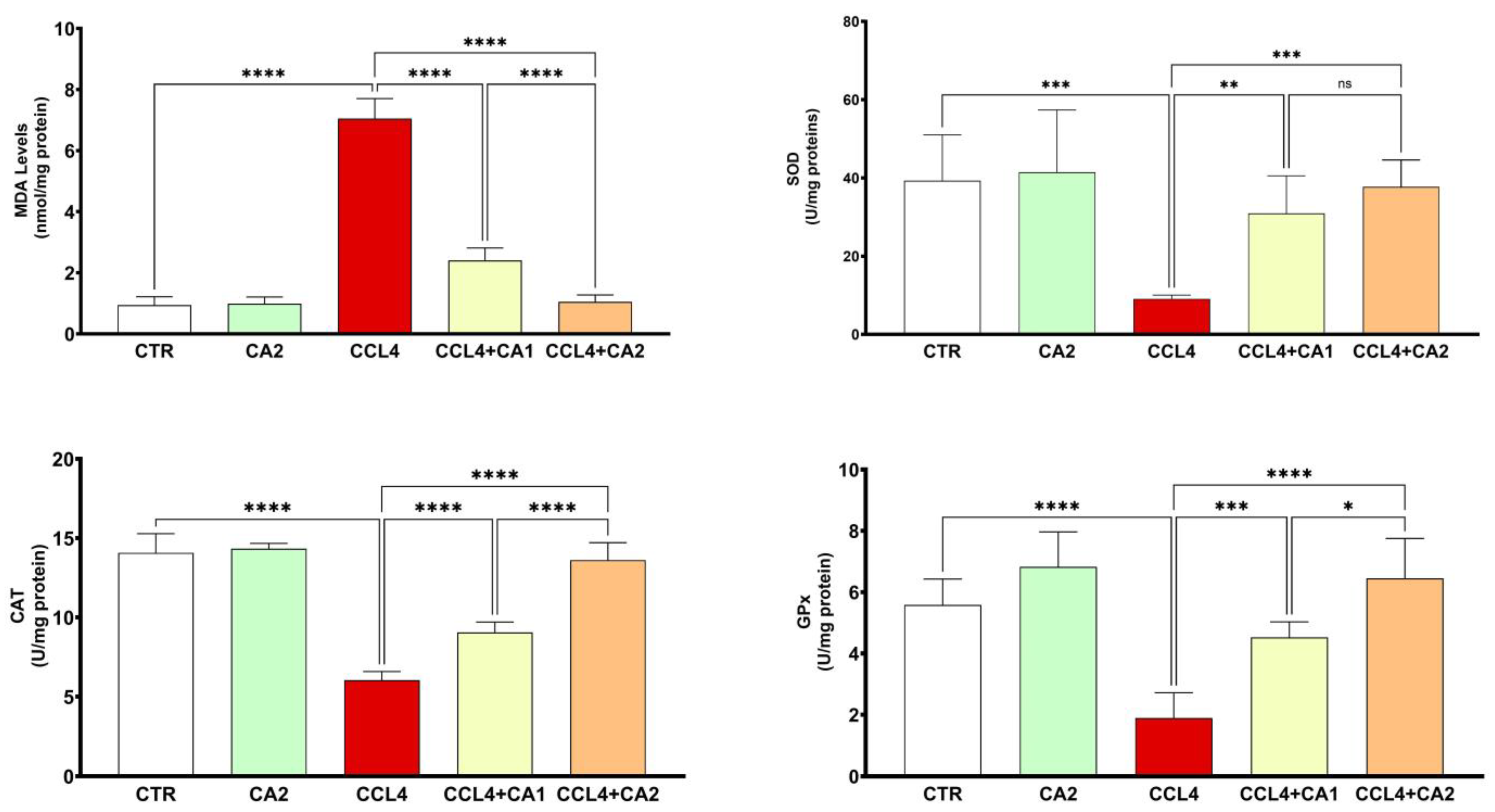 2.8. Effect of CA on Pro-Inflammatory Cytokine Levels