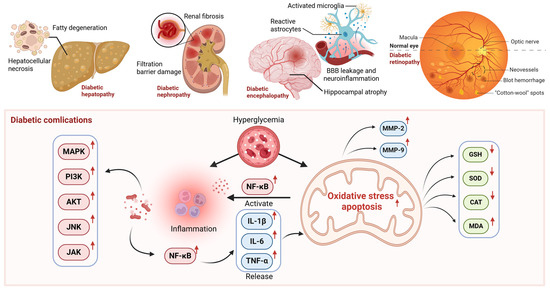 The role of oxidative stress and inflammation in diabetic complications. (created with BioRender.com). Abbreviations: Akt, Protein Kinase B; BBB, Blood–brain Barrier; CAT, Catalase; GSH, glutathione; IL-1β, Interleukin-1 beta; IL-6, Interleukin-6; JAK, Janus Kinase; JNK, c-Jun N-terminal Kinase; MDA, Malondialdehyde; MMP-2, Matrix Metalloproteinase-2; MMP-9, Matrix Metalloproteinase-9; NF-κB, Nuclear Factor Kappa-light-chain-enhancer of activated B cells; PI3K, Phosphoinositide 3-Kinase; SOD, Superoxide Dismutase; TNF-α, Tumor Necrosis Factor-α.