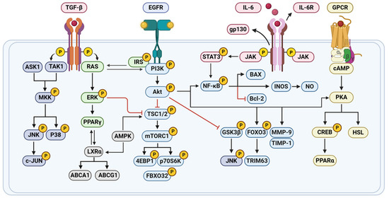 Mechanism of nobiletin in treating diabetes. (created with BioRender.com). Abbreviations: 4EBP1, Eukaryotic Translation Initiation Factor 4E-Binding Protein 1; ABCA1, ATP-binding Cassette Sub-family A Member 1; ABCG1, ATP-binding Cassette Sub-family G Member 1; AMPK, AMP-activated Protein Kinase; ASK1, Apoptosis Signal-regulating Kinase 1; BAX, BCL2-Associated X Protein; Bcl-2, B-cell Lymphoma 2; C-JUN, Jun Proto-Oncogene; cAMP, Cyclic Adenosine Monophosphate; CREB, cAMP Response Element-Binding Protein; EGFR, Epidermal Growth Factor Receptor; ERK, Extracellular Signal-Regulated Kinase; FBXO32, F-box Protein 32; FOXO3, Forkhead Box O3; GPCR, G Protein-Coupled Receptor; gp130, Glycoprotein 130; GSK3β, Glycogen Synthase Kinase 3 beta; HSL, Hormone-sensitive Lipase; IL-6R, Interleukin-6 Receptor; iNOS, Inducible Nitric Oxide Synthase; IRS, Insulin Receptor Substrate; LXRα, Liver X Receptor alpha; MKK, Mitogen-activated Protein Kinase Kinase; mTORC1, Mechanistic Target of Rapamycin Complex 1; NO, Nitric Oxide; p38, p38 Mitogen-activated Protein Kinase; p70S6K, Ribosomal Protein S6 Kinase beta-1; PKA, Protein Kinase A; PPARα, Peroxisome Proliferator-Activated Receptor alpha; PPARγ, Peroxisome Proliferator-Activated Receptor gamma; RAS, Rat Sarcoma; STAT3, Signal Transducer and Activator of Transcription 3; TAK1, TGF-β-Activated Kinase 1; TGF-β, Transforming Growth Factor-beta; TIMP-1, Tissue Inhibitor of Metalloproteinases-1; TRIM63, Tripartite Motif-containing 63; TSC1/2, Tuberous Sclerosis Complex 1/2.