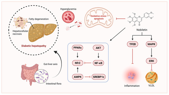 The liver, a central metabolic organ, is often affected in diabetes, notably through NAFLD. NAFLD is bidirectionally linked with diabetes and increases risks of NASH and fibrosis [89,90,91]. Numerous studies corroborate nobiletin’s efficacy in preventing and treating NAFLD [92]. Nobiletin modulates key signaling pathways including Nrf2, NF-κB, AMPK, PPARα, ERK, AKT, and TFEB, contributing to its hepatoprotective effects (Figure 4). It improves liver function, reduces inflammation and oxidative stress, remodels gut microbiota, and mitigates hepatocellular necrosis and insulin resistance, positioning it as a promising therapeutic agent for liver diseases [16]. Nobiletin inhibits apoB100 secretion from HepG2 cells through activation of MAPK/ERK. Dietary nobiletin supplementation attenuates hepatic VLDL overproduction, ameliorates dyslipidemia, and prevents steatosis in HFD-fed Ldlr−/− mice by suppressing SREBP1c-mediated lipogenesis and enhancing fatty acid β-oxidation, thereby improving insulin sensitivity and glucose homeostasis [83].