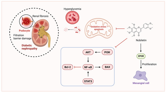 Podocytes serve as the final filtration barrier in glomeruli and are critical in diabetic nephropathy (also known as diabetic kidney disease, DKD) pathogenesis [93]. Autophagy in podocytes mitigates oxidative damage in low-glucose environments but is impaired under hyperglycemia [94,95]. Nobiletin attenuates renal injury through multiple mechanisms, including suppression of STAT3/NF-κB signaling, reducing inflammation and extracellular matrix accumulation in hyperglycemic mesangial cells [96]. In STZ/cadmium-induced diabetic nephropathy rats, nobiletin improves glucose metabolism, restores renal function, reduces oxidative stress, and ameliorates histopathological damage by inhibiting Bax expression and NF-κB nuclear translocation, upregulates Bcl-2 to modulating apoptosis regulators [97]. Nobiletin also exhibits anti-fibrotic effects in chronic kidney disease models by inhibiting the galectin-1/PI3K/AKT pathway, reducing renal fibrosis [98]. Additionally, nobiletin functions as a novel erythropoietin receptor (EPOR) agonist, promoting mesangial cell proliferation and anti-apoptotic signaling, with EPOR activation essential for its renoprotective effects [99]. Another study demonstrated that nobiletin alleviated renal function decline and fibrosis accumulation, and inhibited the renin-angiotensin system and exhibited antioxidant effects [100]. Mendelian randomization (MR) analysis revealed associations between JUN, CASP3, HIF-1α, and MMP-9 with DN, while in silico docking studies demonstrated that nobiletin exhibits high binding affinity with these targets [101]. This suggests the potential of nobiletin in the treatment of DN (Figure 5).