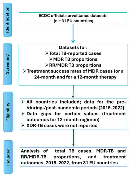 Data on the number of total reported cases of TB, MDR-TB cases, RR/MDR-TB cases, treatment success rates for MDR-TB cases undergoing 24-month and 12-month therapies were obtained from the European Center for Disease Prevention and Control (ECDC) website: https://atlas.ecdc.europa.eu/public/index.aspx (accessed on 1 July 2025). The data from 2015 to 2022, were used to examine the impact of the COVID-19 pandemic on the epidemiological spread of treatment-resistant TB cases in the European Union and its members individually.